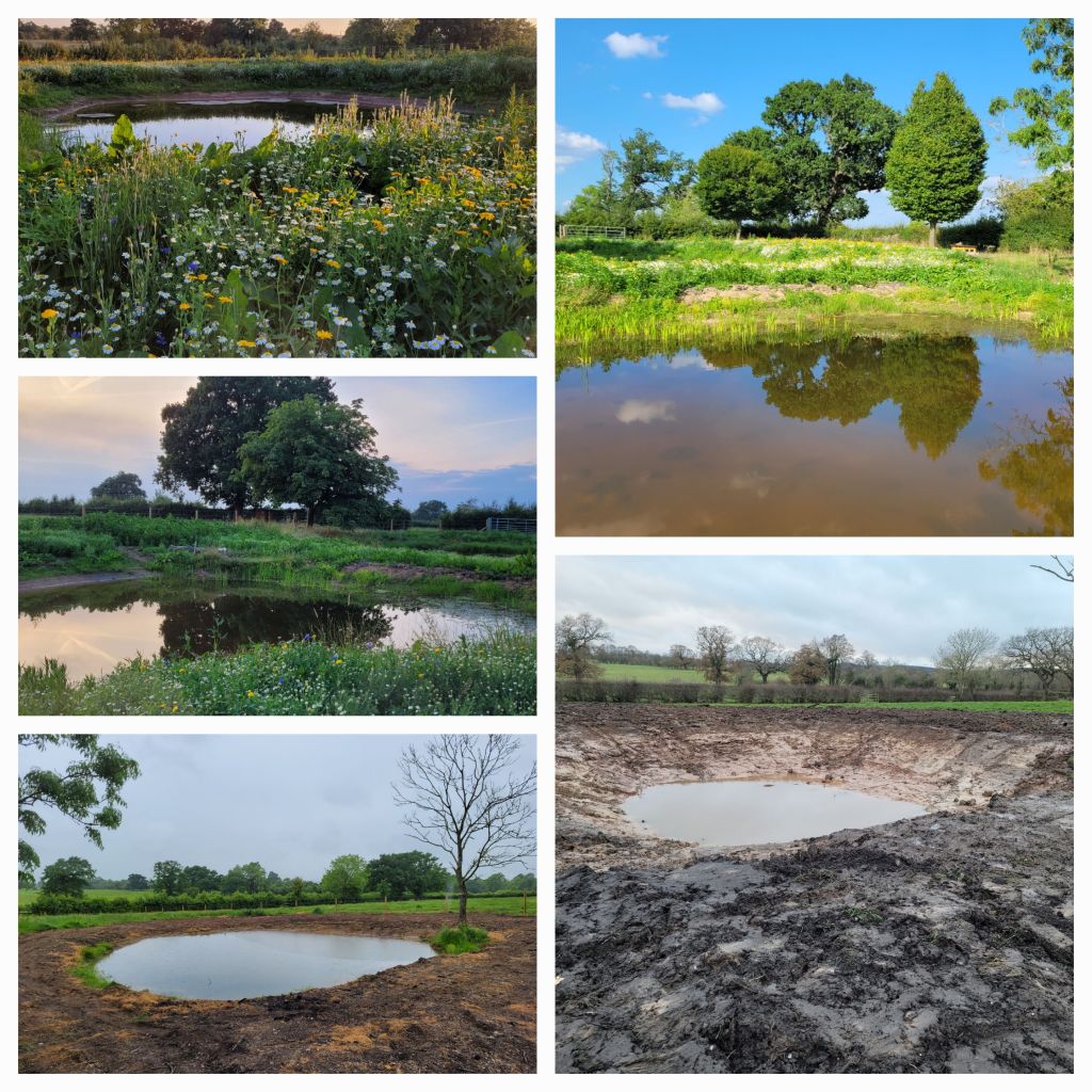 The ponds we dug in December have filled up and, entirely of their own accord, self-populated with aquatic plants and insects and, most importantly, lots and lots of baby newts – which was of course their primary objective! The new wildflower meadow we sowed around our ponds has taken well and is currently a carpet of colourful cornfield annuals, providing a stunning late summer display while sheltering the perennial meadow seedlings that will follow behind. The 500+ trees we planted in February appear to have largely overcome the dry summer weather and are now well out of their protective tubes, while the hedges, left uncut since we arrived, are now laden with fruit that will provide a food source for overwintering birds.
